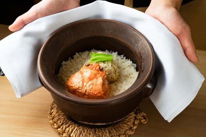 「松葉蟹と三つ葉の土鍋ご飯」 スタッフが蓋を開けたとたん、歓声が上がる土鍋ご飯。様々な調理法で最後まで飽きさせずに蟹料理をまとめたコースでした。