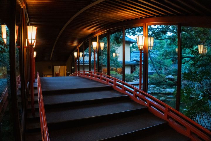 出雲そばのランチを済ませて、タクシーで界 玉造へ。モダンなファサードからロビーへ足を踏み入れると、目の前に端整な日本庭園が現れます。界 玉造のコンセプト「いにしえの湯と出雲文化を遊ぶ宿」がまさにぴったりの風情です。