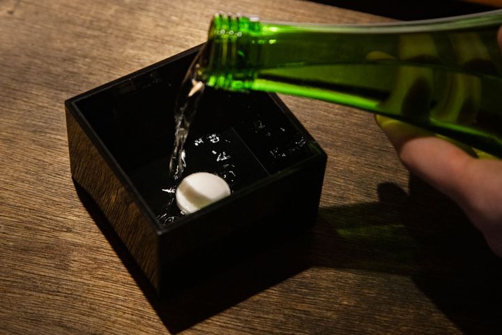 大浴場入口にある「美酒処」。枡にシートマスクと地元の酒蔵・米田酒造の日本酒「豊の秋」を注げば、自分専用の日本酒マスクができあがり。