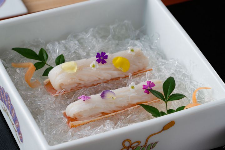 「松葉蟹の蟹刺し 霜降り仕立て」 驚くほど新鮮な蟹刺しは、つるんとしたのど越し。蟹肉の旨味が口中に広がります。
