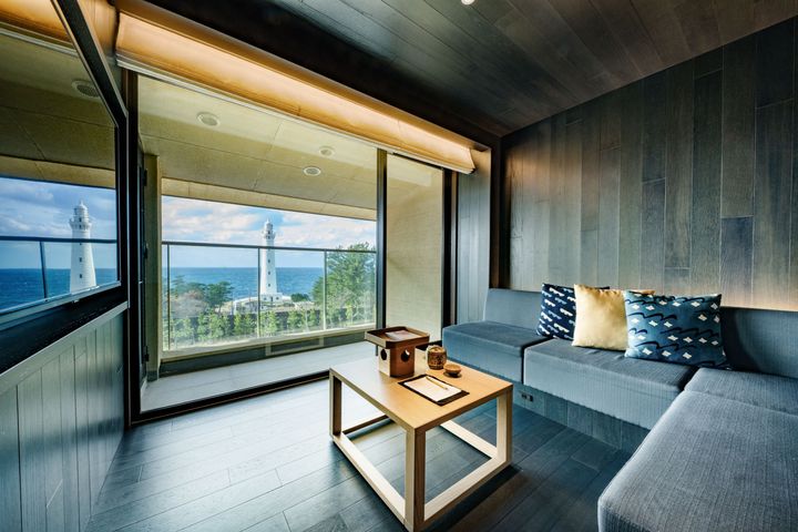 灯台が望める側のお部屋は、シックな藍色がアクセント。夕日をバックに白い灯台の雄姿は壮大。