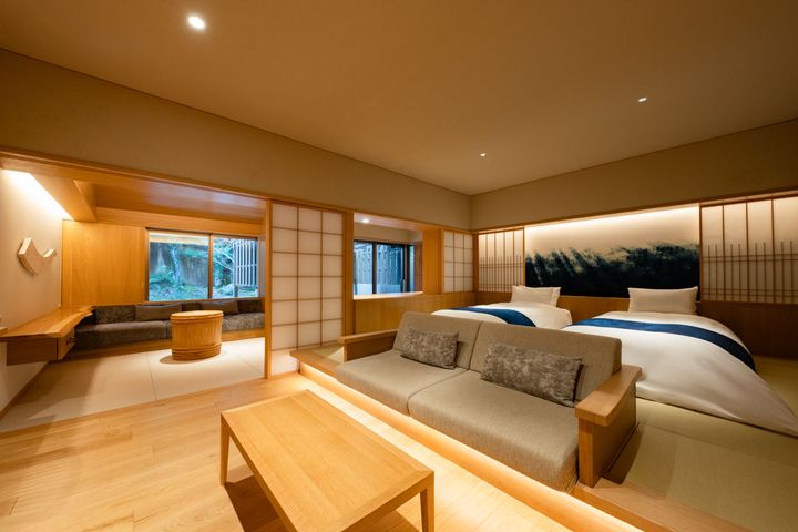 扉を開けた瞬間、ふわりと立ちのぼるのは、清々しい木の香り。日本酒発祥の地・出雲を象徴する酒樽をモチーフにしたテーブルが、さりげないアクセントになっています。ベッドとリビングエリアの配置はどこか大胆で、それでいて心地いい。思い思いに時間を過ごしやすい造りです。そして何より、「界 玉造」は全室が客室露天風呂付き。美肌の湯として名高い玉造温泉を、誰にも気兼ねすることなく、好きなタイミングで味わえる贅沢があります。この湯を目当てに多くの人が足を運ぶのも、自然と頷ける魅力です。