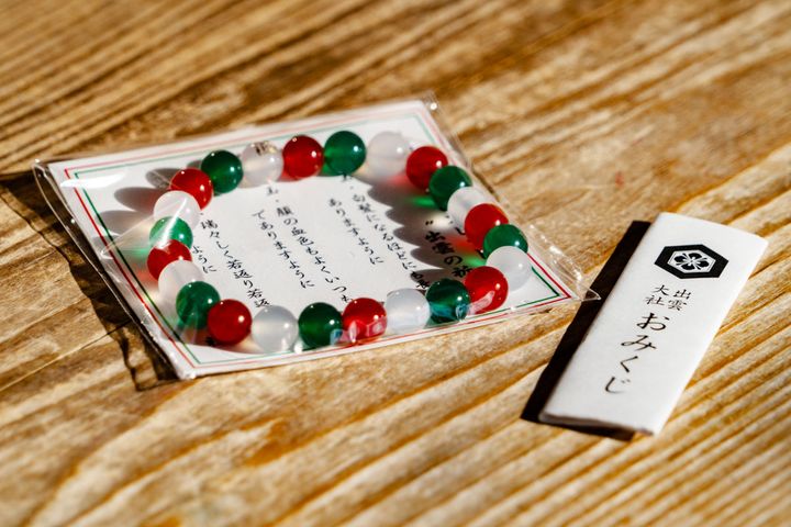 守りや縁起物を選ぶのも楽しみのひとつ。出雲大社のおみくじは大吉、凶などの吉凶がないのが特徴。私は今年いい方向へ向かうので努力せよ、とのこと。長寿や健康を願う美保岐玉ブレスレット(初穂料2,500円)はお土産に。