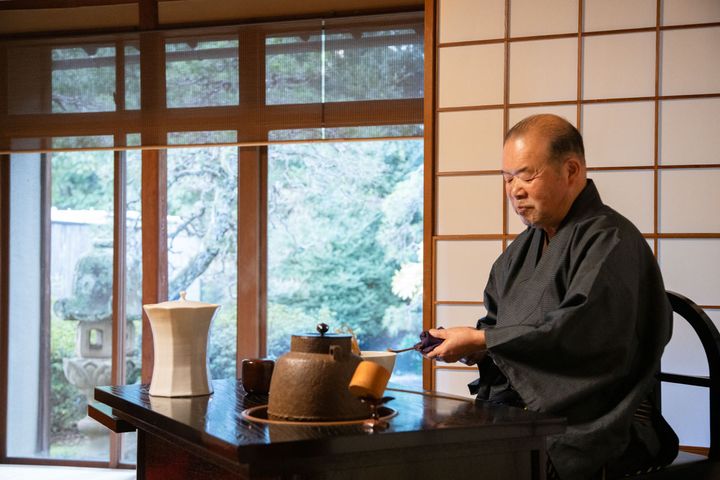 「界 玉造」に戻るとちょうど15時半。離れの茶室で茶の湯体験ができるとのこと。日本庭園の飛石を進んでいくと、そこが「界 玉造」の茶室、蛙瞑庵(あめいあん)です。この日、お点前を披露してくださる三斎流の影山先生が、松江に茶道を広めた松江藩主 松平不昧公のこと、松江では子どものころからお茶に親しむ環境であることなどを、楽しくお話しくださり、寛いだ気分になりました。