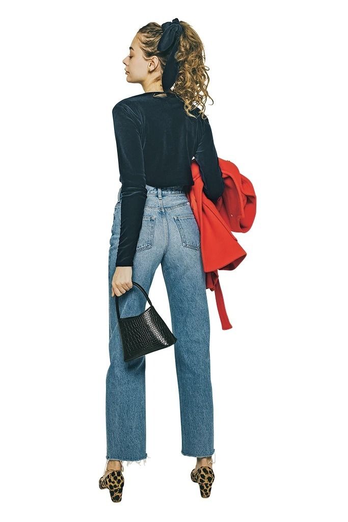 気どらないドレスアップにも頼れるのはやっぱりデニム。トップスとシュシュをベロア素材でそろえ、あえてヒップラインをアピールするジャストフィットのデニムを合わせて後ろ姿も抜かりなく。そんなシンプルな上下を軸にすれば、ヴィヴィッドなカラーコートや柄パンプスなど、色柄の遊びも上手くまとまる。