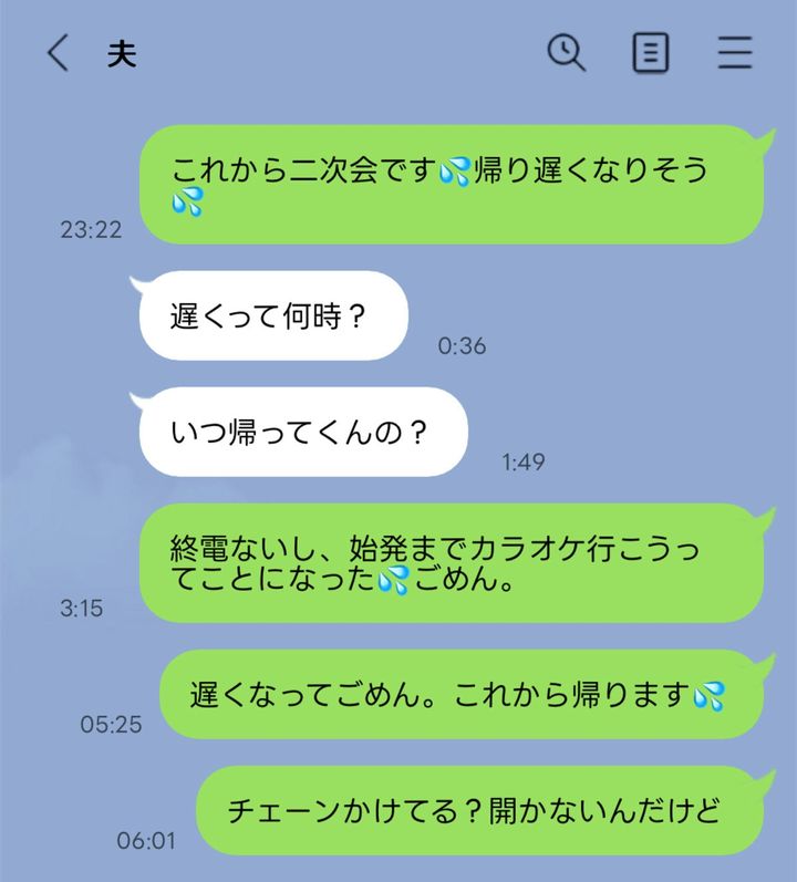 育休中の飲み会で、「朝帰りをした」という、投稿者さん。それが原因で、夫にムシされ一週間がたち、「どうしたらいいかわからない」という投稿を紹介します。飲み会から帰宅すると、ドアにチェーンがかけられ、しめ出されてしまった…という投稿者さん。LINEは既読無視され、同じ空間にいても、話をしてくれないそう。ここまでのケンカが初めてで、離婚する可能性もあるのか、気になっているそうです。