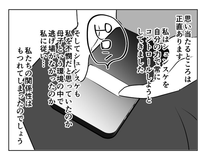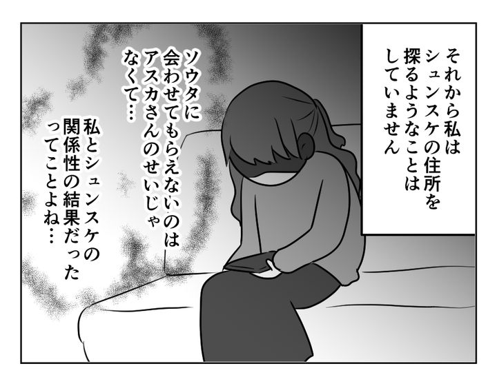 ひとまずカツコさんは改心? したかどうかは分かりません。人はそう簡単に変わることはできないのです。けれどもソウタくんに会わせてもらえないのはアスカさんのせいではないということは、よく分かったのではないでしょうか。写真だけでも見ることができる。それはシュンスケさんのせめてもの気配りで成り立っているものです。どうかこの先、シュンスケさんがカツコさんに怯えることのない平穏な生活ができるようになりますように……そう祈りたいと思います。