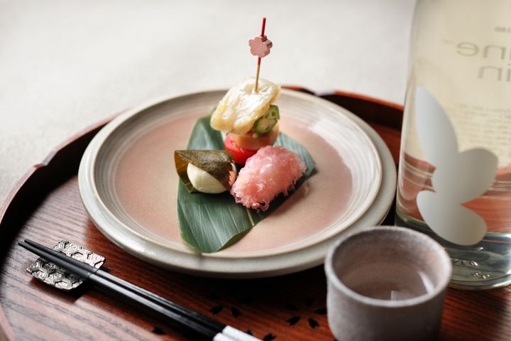 桜柄の敷き紙や桜型の箸置きで設えた席で、ライトアップされた桜を楽しみながら、春の会席に舌鼓。メニューにも桜をかたどった百合根や桜の塩漬けなどを使用しています。メインの台の物は、山口県の郷土料理「瓦焼き」から着想を得た「鶏とふぐの瓦焼き」。仕上げに柑橘の果汁を使用して、さわやかな香りに包まれた旬の食材を味わえます。