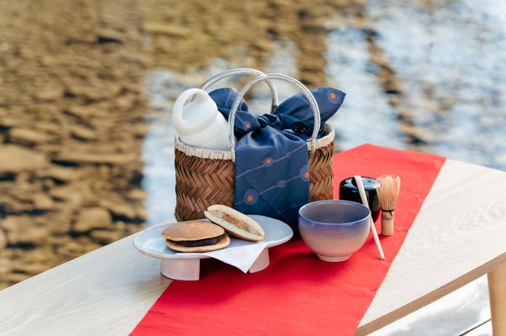 翌朝は、静かな朝の桜を眺めながら特別な時間を過ごせる「さくら野点」を体験。「界 長門」の目の前にある「あけぼの橋」に設けられた特別席で、「深川萩(ふかがわはぎ)」の器で野点に挑戦します。深川萩は、江戸時代から多くの茶人に愛されてきた萩焼のなかでも特に格式が高いとされているそう。