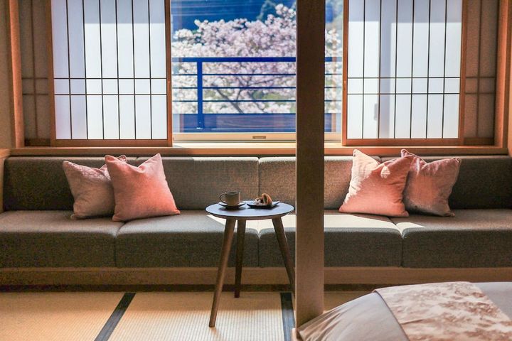 客室でも桜を満喫♪ 室内は桃色のクッションやベッドランナーなど、花見の気分を盛り上げてくれる特別な設えに。窓の襖を開けると音信川沿いの桜が目の前に広がります。プライベートな空間で、時間を忘れてのんびりと桜を観賞できます。