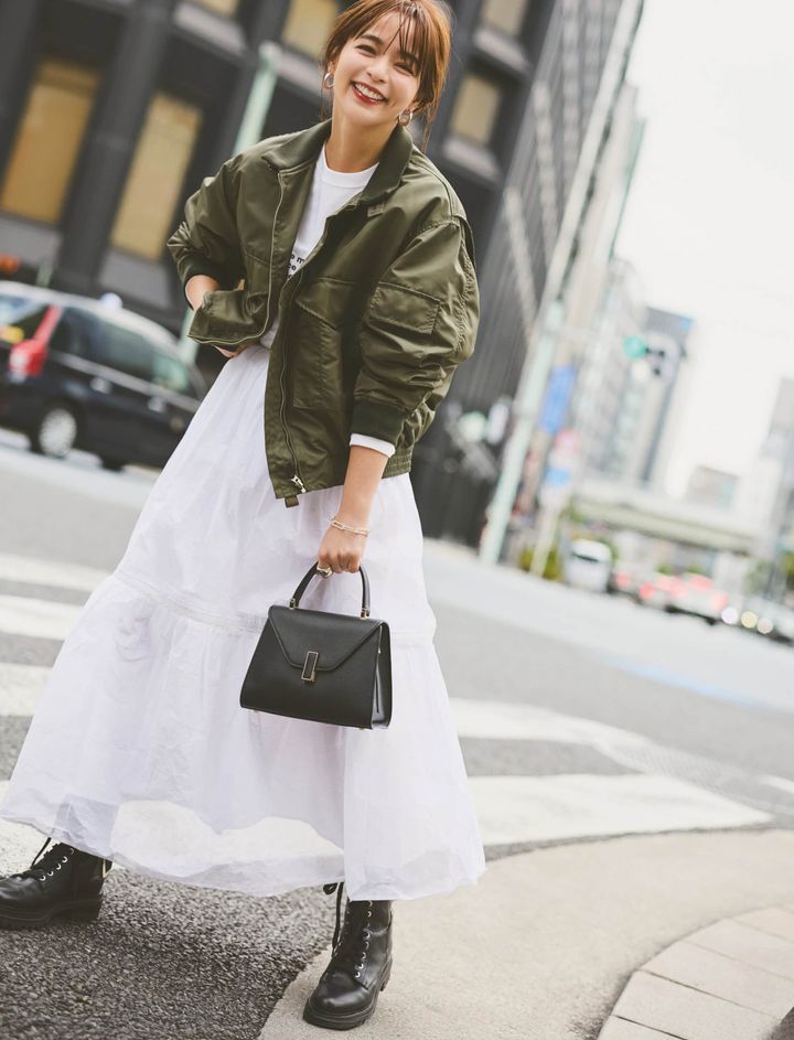 華やかスカートに合わせるなら短丈のカーキブルゾンが◎。ハリのある素材が透け感スカートを引き締め、甘さを程よく中和してくれます。ラフすぎないシルエットで、40代も取り入れやすいバランスに。