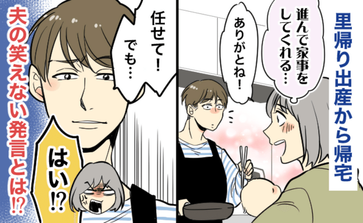 2カ月半の里帰りを終えて、自宅での初育児。授乳やあやすのに手を取られて家事ができない中、夫が料理や片づけをしてくれました! 素直に感謝を伝えると、思わず「オイ!」とつっこまずにはいられないひと言が夫から返ってきたのです……。