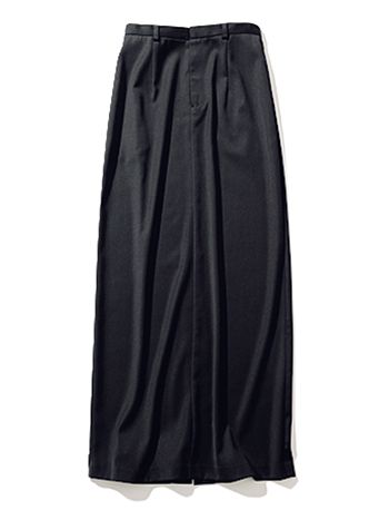 黒ロングスカート/AKTE 靴を問わず脚を長く見せる効果がある、直線的なハイウエスト。やわらかな質感でシワができにくい。後ろ側の深めのスリットで脚さばきは良好。
