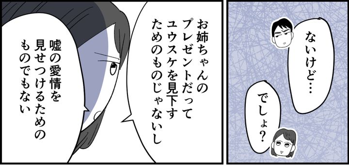 ユウスケの歪んだ劣等感と、その裏にある深い悲しみが見えた気がしました。しかしだからといって姉の厚意を横取りするなんて、許される行為ではありません。そして私は問いかけます。「あなたの親族が何もくれないことで、私がユウスケを責めたことが一度でもあった?」