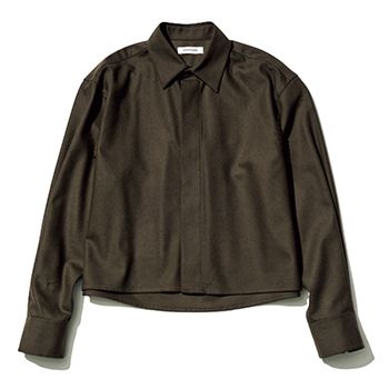 ダークブラウンシャツ/Edition(エディション 表参道ヒルズ店) なめらかなウールが導くノーブルな表情。えりつきトップスのようにも着られる比翼仕立てのショート丈なら、ほっこりしがちな素材も切れ味よく整う。