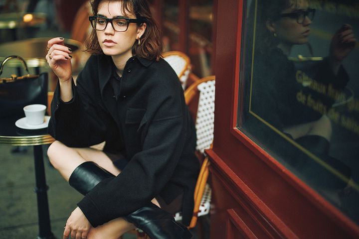 黒シャツジャケット/HER. ブラウンミニスカート/KBF 黒を起毛感のある風合いでマイルドな表情に。見た目にもあたたかい質感がミニスカートの緊張感を和らげ、体感温度も上昇。素肌を隠すロングブーツでつなぎ、ミニをバランスよく。
