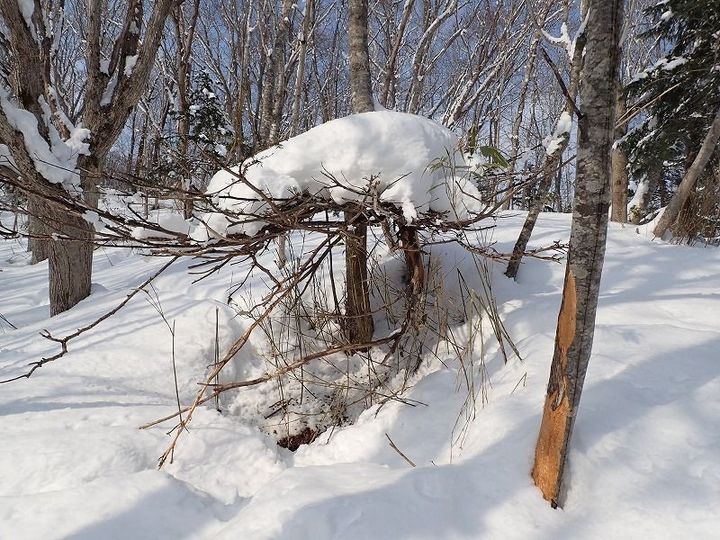 曲がった枝の下のスペースはエゾシカが休憩した場所。ちゃんと屋根付きの場所を見つけて休んでいます。