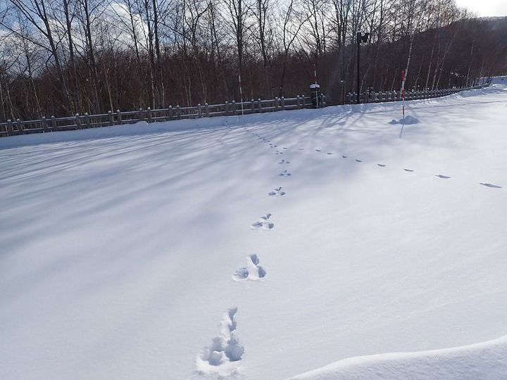 ちなみに、右に伸びてる一本道はキタキツネです。モデルのように1直線に歩きます!