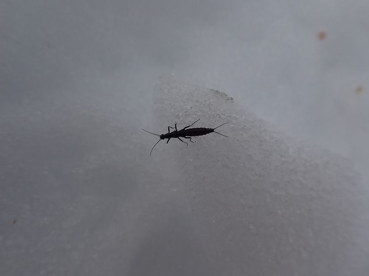 大きさは1.5センチメートル程度で細長い形をしています。夏の間は川の中で幼虫時代を過ごして、雪が降る頃に成虫になって陸に上がってきます。寒すぎても動かないので、気温が0度前後で雪晴れた日によく見かけます。