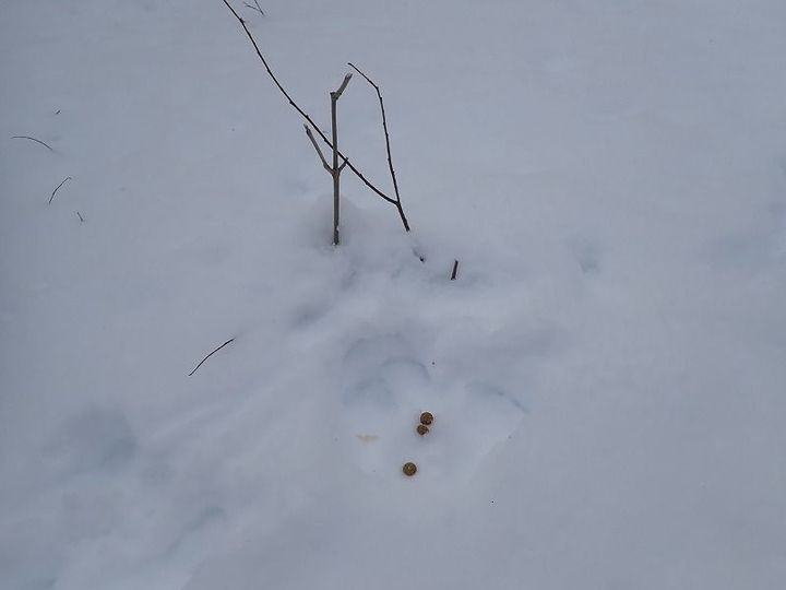 奥に大きめの足跡が2つ、手前に小さい足跡が2つあってカタカナの「ハ」の字に見えますが、これはエゾリスの足跡です。軽快に森を走り回っているのが伝わりますね。