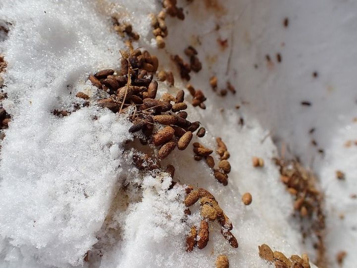 どうやら地面に落ちてきた種を食べているようです!他にも食べているものはあるかもしれませんが、ここまで生き残っているということは冬に成虫になってもなんとかなっているということなんですね。