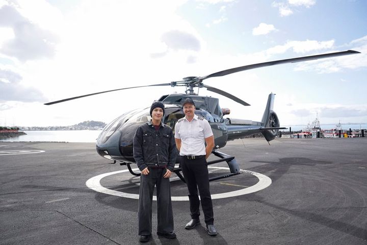 ワイヘキ島へはフェリーが定番ですが、今回は往路をヘリで贅沢に。ハウラキ湾の青を眼下に眺めながら、特別な時間を。