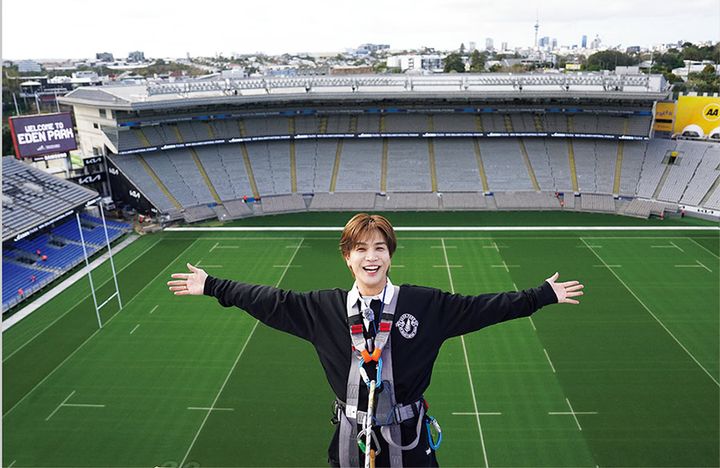 ハーネスを装着してスタジアムの屋根を歩くスリリングな体験も。オークランドの街並みを一望できる特別な絶景が楽しめます。岩田さんも、その開放感と気持ちよさに大感激!
