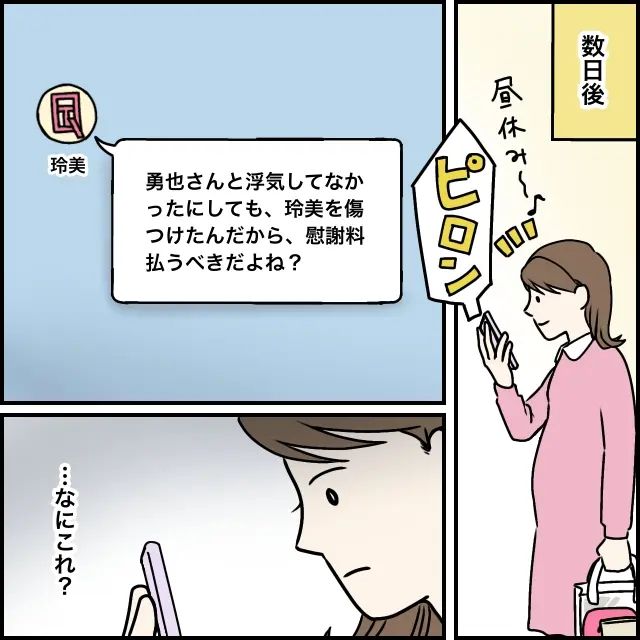それから数日後、会社のお昼休憩中に1通のメッセージが届きました。見ると、「勇也さんと浮気してなかったにしても、玲美を傷つけたんだから、慰謝料払うべきだよね?」という玲美さんからのメッセージでした。・・なにこれ?あまりにめちゃくちゃな主張に目が点でした。