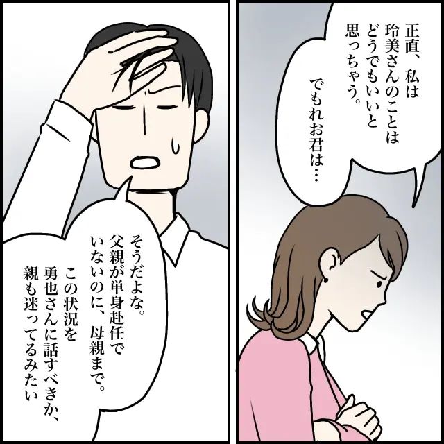 玲美さんから身に覚えのない勇也さんとの不倫を疑われて困っていた私。ようやくその誤解も解けてホッとしていたのですが、今度は玲美さんが息子のれおくんを置いていなくなってしまったのです。勇也さんが単身赴任中の今、れおくんと一緒にいてあげられるのは玲美さんだけなのに・・。