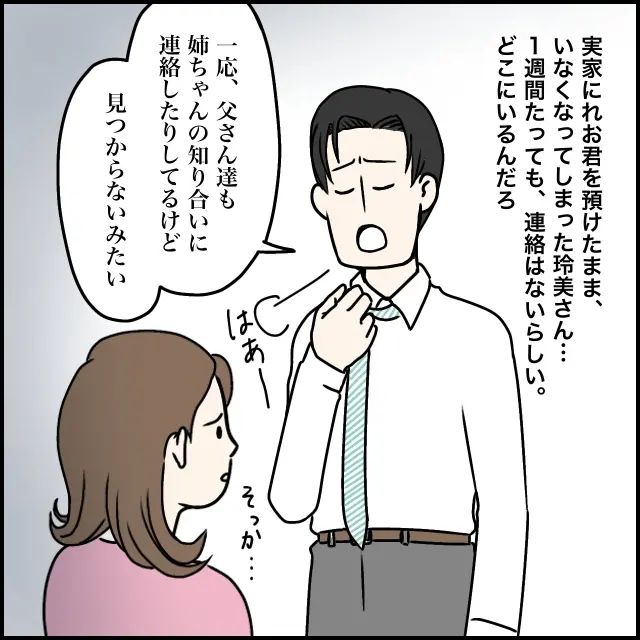 玲美さんは、実家にれおくんを預けたままいなくなってしまったそうで、1週間たっても一切連絡がないとのこと。「一応、父さん達も姉ちゃんの知り合いに連絡したりしてるけど、見つからないみたい」と太一は溜息をつきながら状況を教えてくれました。