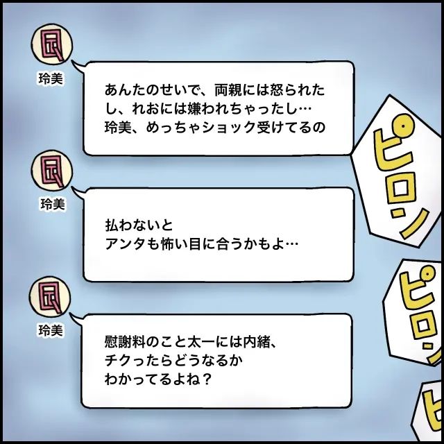 メッセージは次々に届きました。「あんたのせいで、両親には怒られたし、れおには嫌われちゃったし・・玲美、めっちゃショック受けてるの」「払わないとアンタも怖い目に遭うかもよ・・」「慰謝料のこと太一には内緒。チクったらどうなるかわかってるよね?」どれもこれも意味がわかりません。両親に怒られたのも、れおくんに嫌われたのも、玲美さん自身の言動の結果です。私に責任転嫁して慰謝料を請求するなんてあり得ません。