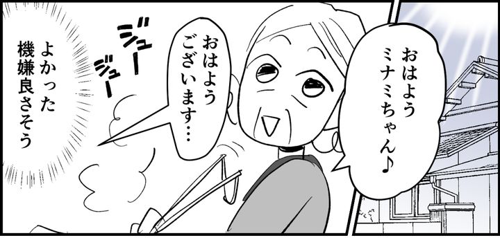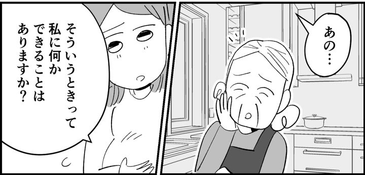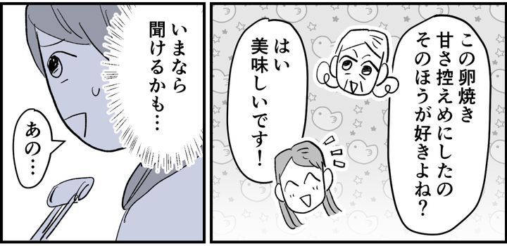 翌朝、昨夜とは打って変わって、義母は朝から機嫌がいいようです。穏やかな笑顔に私は少しほっとしました。機嫌がいい今なら少し踏み込んだ話をしても大丈夫かも……! しかし、笑顔だった義母の表情は、少し気まずそうなものに変わりました。ですが、すぐにまた優しい表情に戻ります。