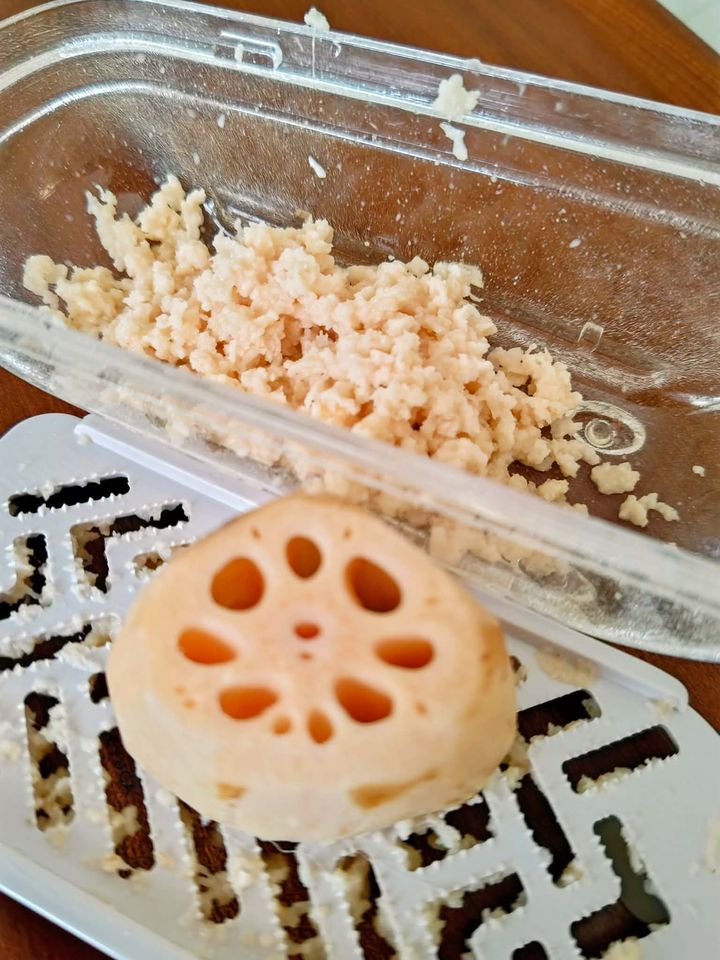 1. れんこんは皮をむいて半量をすりおろし、もう半量は粗みじん切りにする。