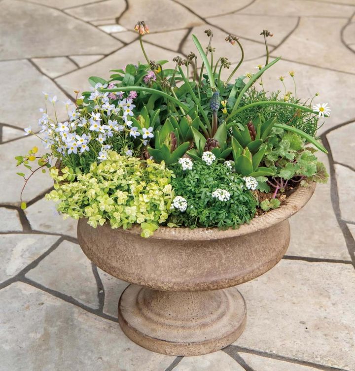 芽を出した球根をそっと植えた季節の目覚めを感じさせる寄せ植え