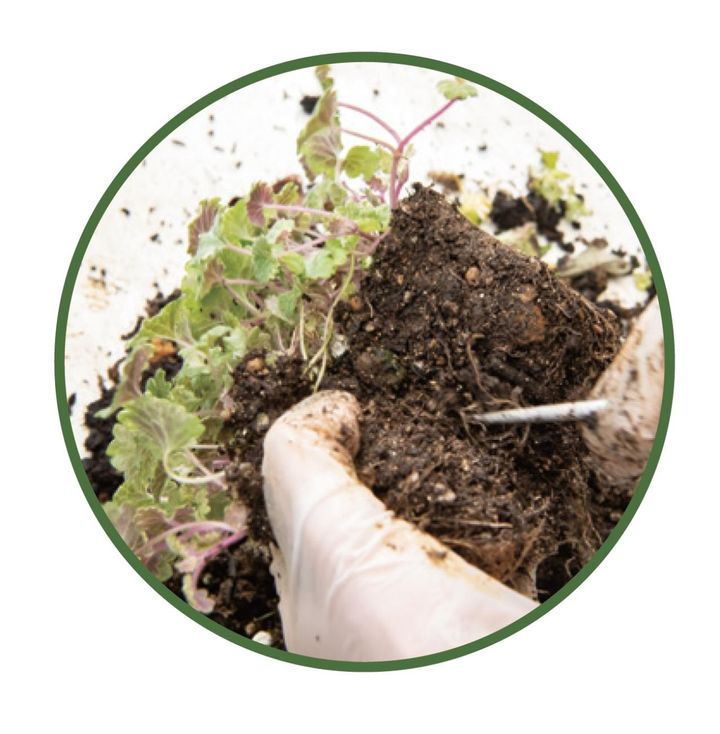 グレコマはポットから出し、根かき棒で根元の下から根を縦に割り、手で半分に裂く。ワイヤープランツもグレコマ同様に株分けして、植えつける。
