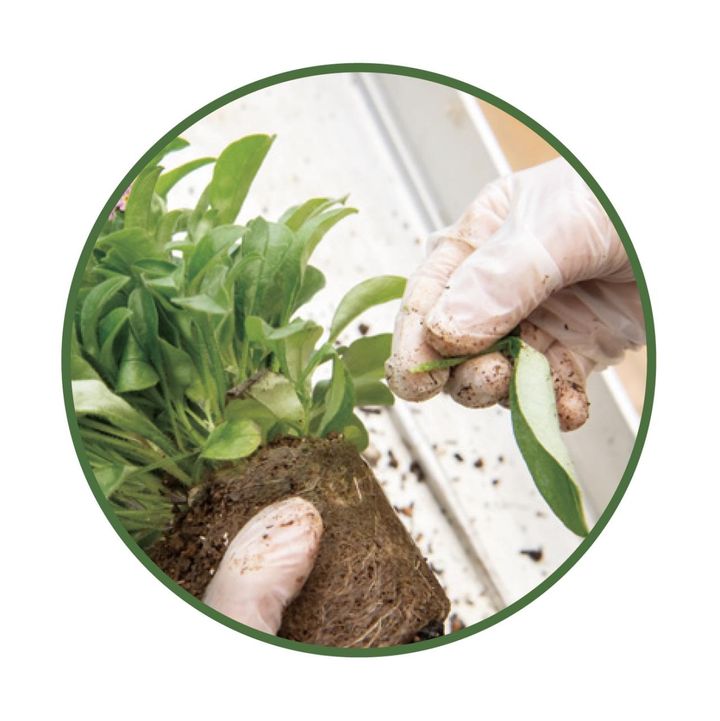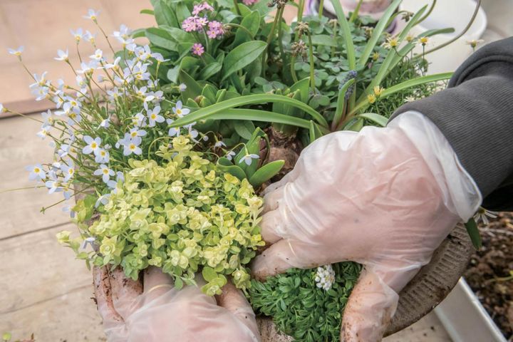 ワスレナグサは混み合っている下葉などを取り除く。根をほぐし、隙間に入るよう根鉢を変形させ、ヒヤシンスの後ろに植えつける。
