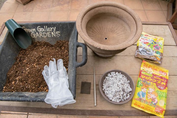 (右から時計まわりに)鉢(36cm×30cm、高さ20.5cm)、土壌改良材(顆粒状)、緩効性肥料(粒状)、鉢底石、根かき棒(割り箸でも可)、鉢底ネット、園芸用手袋、培養土、土入れ
