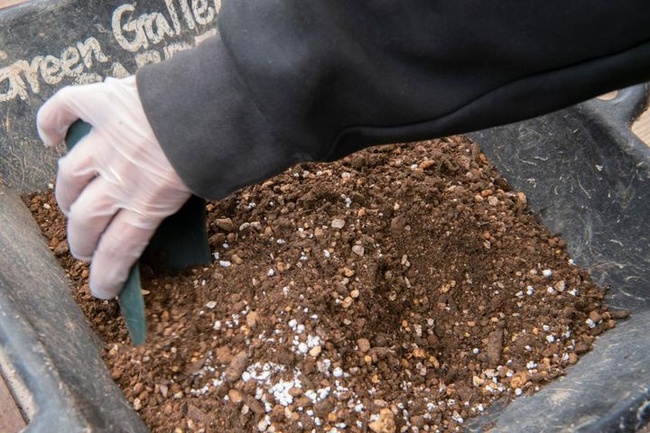 園芸用手袋をつけ(あれば)、緩効性肥料を規定量、培養土に混ぜる。