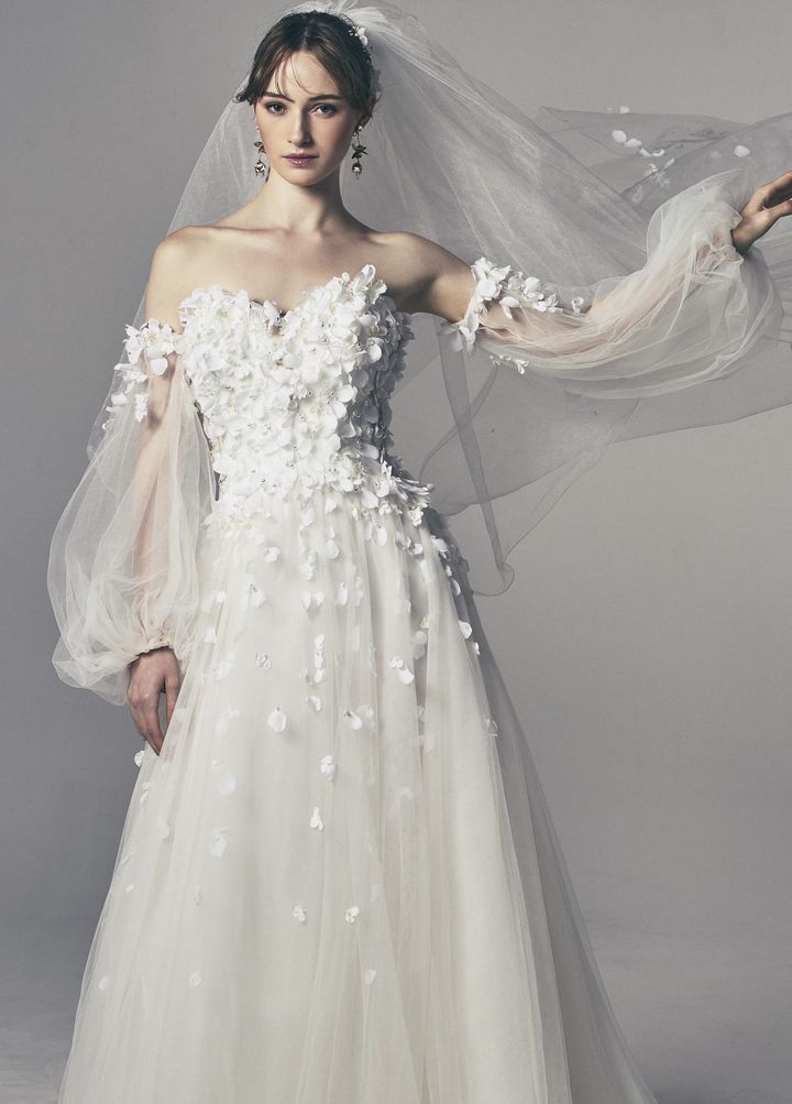 上半身からスカートにかけて、立体的な小花モチーフをたっぷりとちりばめたAラインドレス。可愛らしいディテールですが、細身のシルエットとパフスリーブを長袖にすることで甘すぎない大人のブライズスタイルに。ドレス ¥418,000、ベール¥66,000(2点共ユミカツラ プレタクチュール/ユミカツラ東京 3階 tel.03-3403-7867)