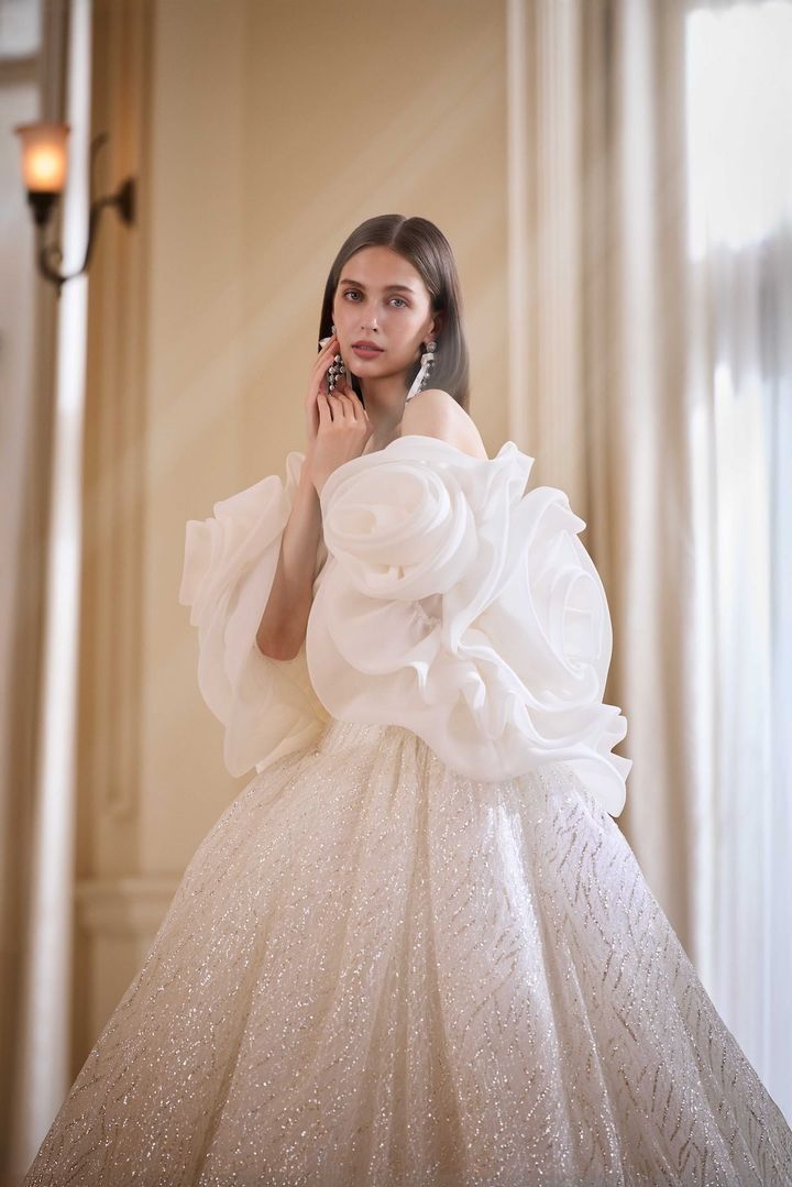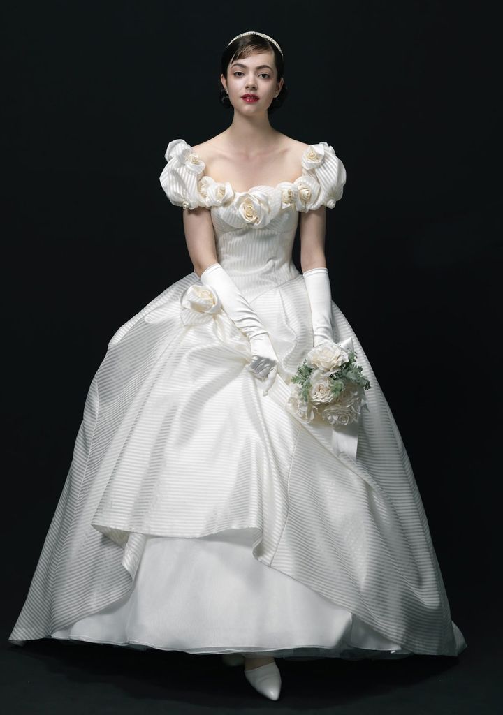 ストライプシルクオーガンジーの生地を用い、スタイリッシュな雰囲気を醸す一着。デコルテにフラワーモチーフをあしらい、パフスリーブ+独自の立体構築シルエットのスカートで華やか&スイートなムードを漂わせます。ドレス¥572,000[レンタル価格](エマリーエ/エマリーエ ウエディングドレスサロン tel.03-6804-3090)
