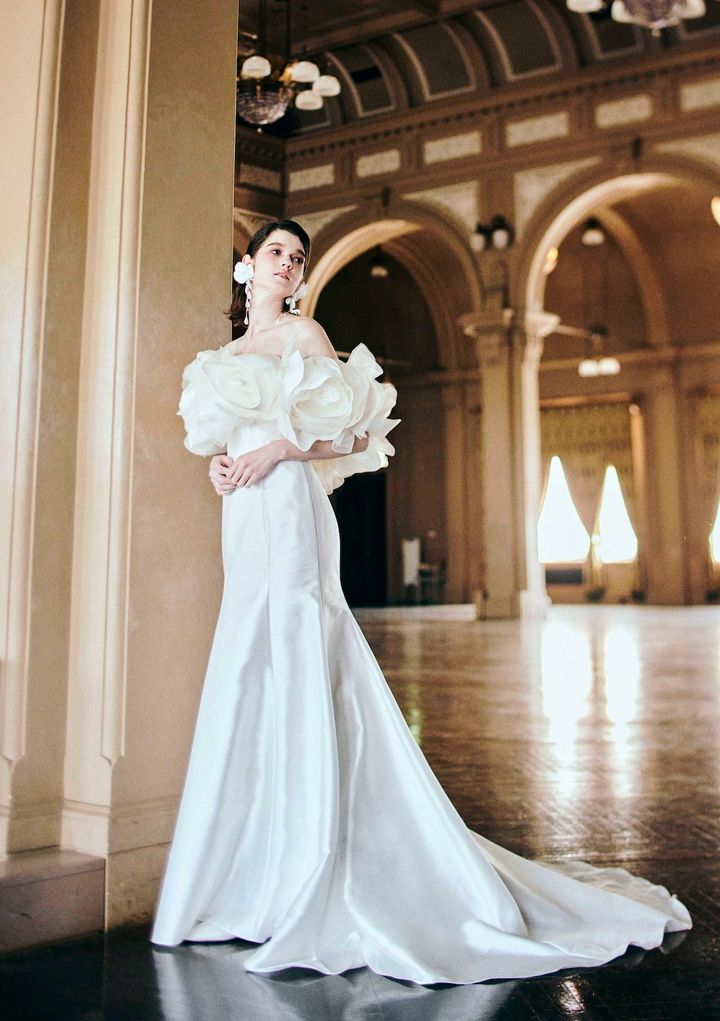 肩口とウエストにフラワーモチーフをあしらっていますが、スカートの裾もまるで花びらのよう。さまざまな種類のサテン素材を使って表現した光沢が、ドレスの美しさを際立たせます。ドレス¥517,000[レンタル価格](エマリーエ/エマリーエ ウエディングドレスサロン tel.03-6804-3090)