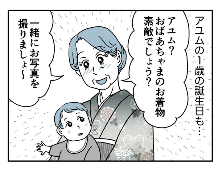 おぉ……お義母さんは何かの記念日や節目ごとに着物を楽しんでいるのですね。お祝い事にかこつけて、着物を新調しては嬉しそうに披露しているようです。とりあえず孫のアユムくんのことは可愛がってくれているし、スミレさんの望むとおりの平穏な関係が続いているようで一安心(?)。こんな天真爛漫なお義母さんなら、義実家のしきたりなど細かくいろいろ言われることもなさそうですしね。