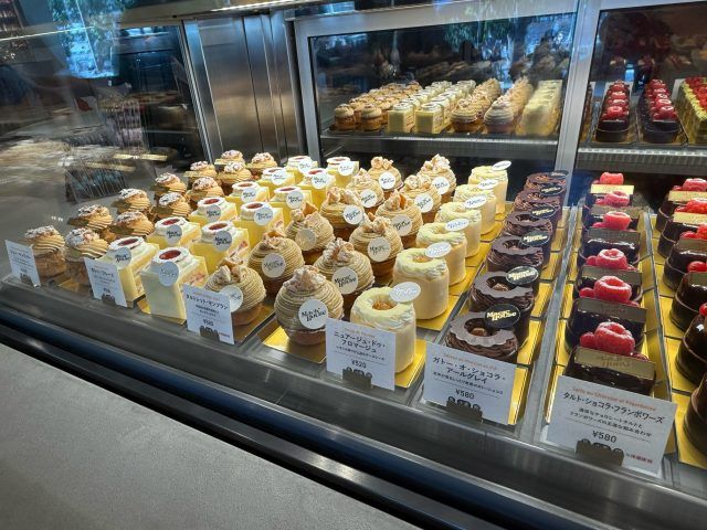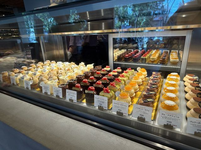 色々ある中から、左下から時計回りでタルトシット•モンブラン、フランボワーズ•ピスターシュ、シュー•キャラメル、サヴァラン•オランジュをいただき。一品一品が素晴らしい作品。手が込んでいてとてもおいしかったです。