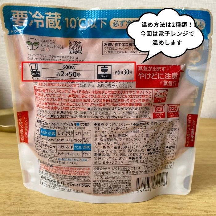 温め方法は、600Wの電子レンジで2分50秒。ボイルで6分30秒です。