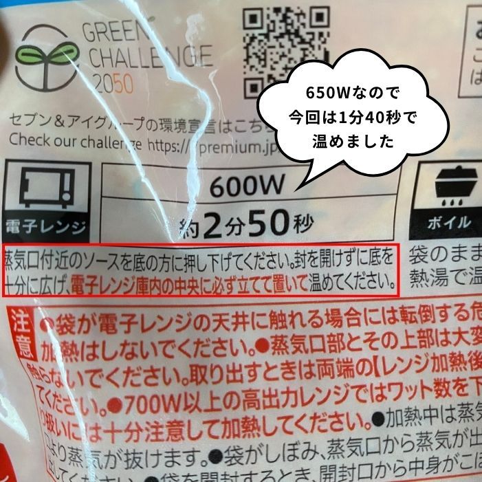 家の電子レンジが650Wなので、少し温め時間を減らして…