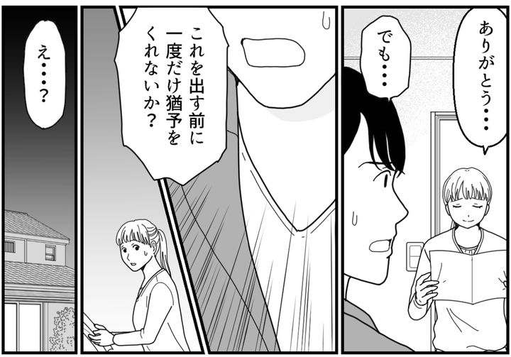 でも俺にも伝えたいことがある。俺はエリの目をしっかり見て、話しかけた。「でも、これを出す前に一度だけ猶予をくれないか?」これからの俺を見てほしい……そうエリに話をしようと思っている。