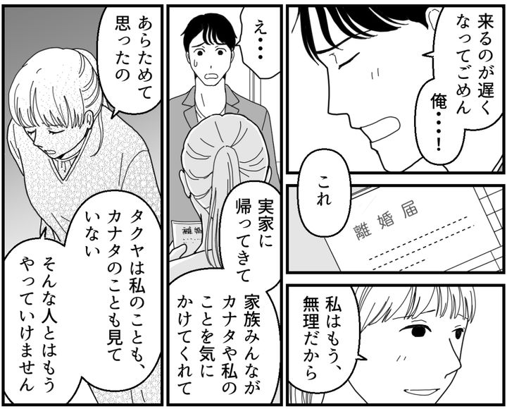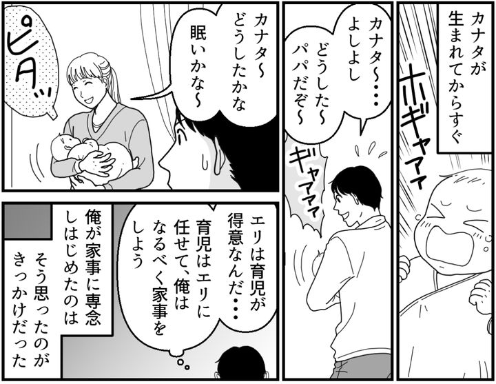 俺(タクヤ)は、妻のエリと2才の息子・カナタを育てている。エリが職場復帰を果たしてから、わが家は大忙しな日々。だから俺は得意な家事を頑張ってきた。なのにエリは不満を募らせ、カナタを連れて実家に帰ってしまった。実家の母には「大切なのはエリさんがどう考えているか」だと言われた。義母から伝えられた「一緒に育児がしたかった」というエリの言葉が頭をかすめる。俺がエリの言葉に聞く耳を持たなかったから、こんなことになったのだ。