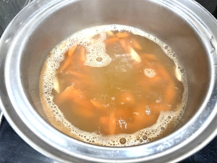 1. 鍋にだし汁を入れて沸騰したら、ごぼうとにんじんを入れて3分くらい煮る。