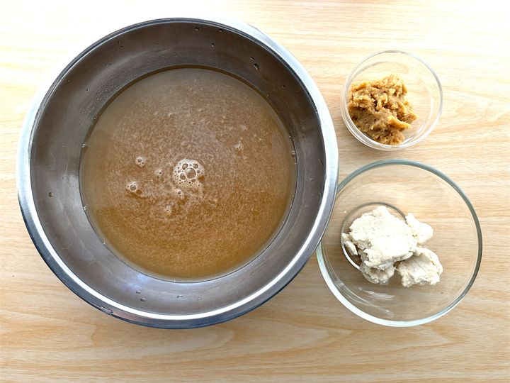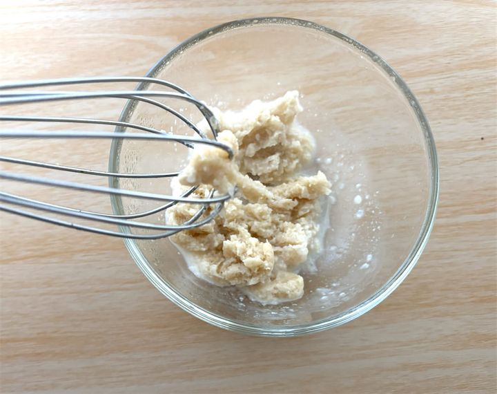 3. 耐熱容器に酒粕と水大さじ1(分量外)を入れる。500Wの電子レンジで30秒~40秒くらい加熱し、酒粕をやわらかくしておく。