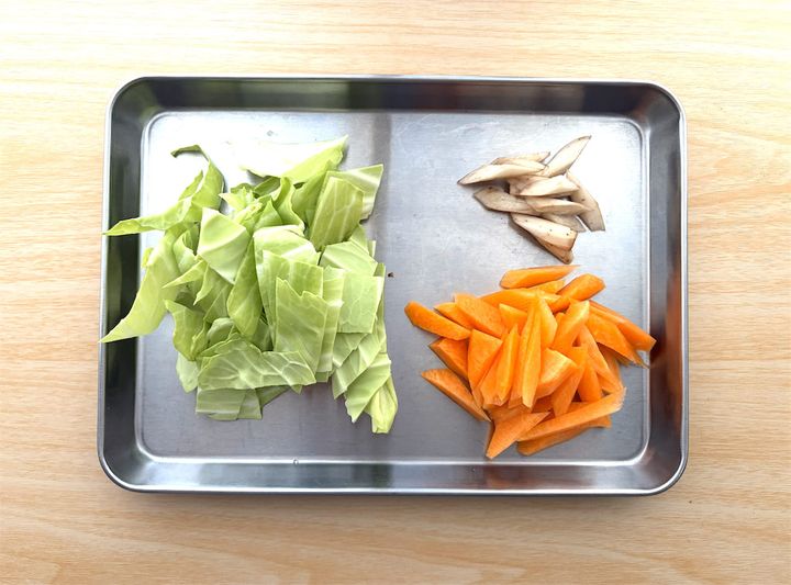 ごぼうとにんじんは2~3cmほどの細長い乱切りに、キャベツは5cmほどの一口大に切る。青ねぎは小口切りにしておく。